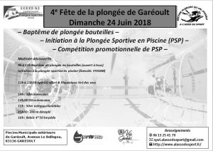 Pour sa 4e édition, la fête de la plongée se déroulera le 24 juin 2018 à la piscine municipale de Garéoult. Comme chaque année, baptêmes de plongée bouteille pour les plus de 12 ans et initiation à la plongée sportive le matin, Compétition promotionnelle de PSP l’après midi.