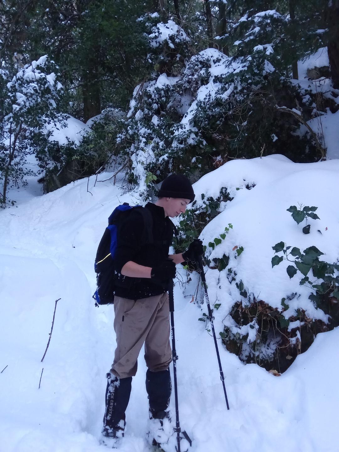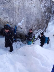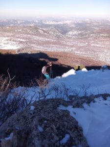 Malgré une température négative ( -5 à -7°), le groupe se met en marche et atteint rapidement le monastère de Sainte-Marie-Madeleine puis le Col St-Pilon. La crête de la Sainte-Baume offre une vue magnifique à 360°. Impossible de ne pas s’arrêter et de déjeuner tout en observant le paysage. Un petit café (merci Sandrine) et le groupe repart vers le Pas de la Cabre ou Olivier avait préparé un exercice de recherche de victime d’avalanche.